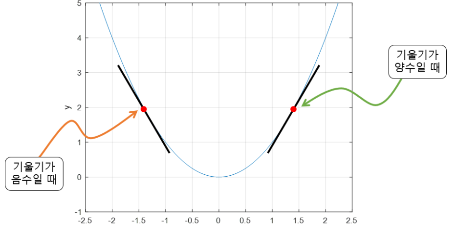 미분했을 때 기울기가 음수이면 양수 방향으로 이동, 기울기가 양수면 음수 방향으로 이동시킨다.