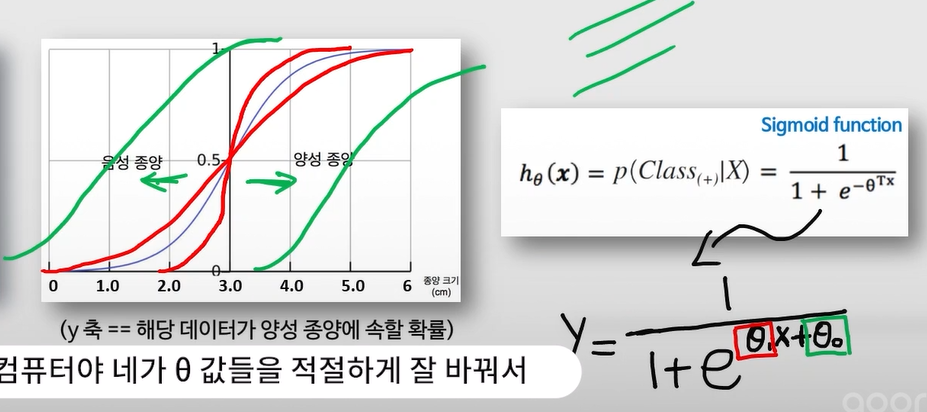 - Sigmoid function의 정확한 y값을 받아 양성일 확률을 예측하거나, 특정 cutoff(threshold or boundary)를 넘는 경우 양성, 그 외에는 음성으로 예측할 수 있음