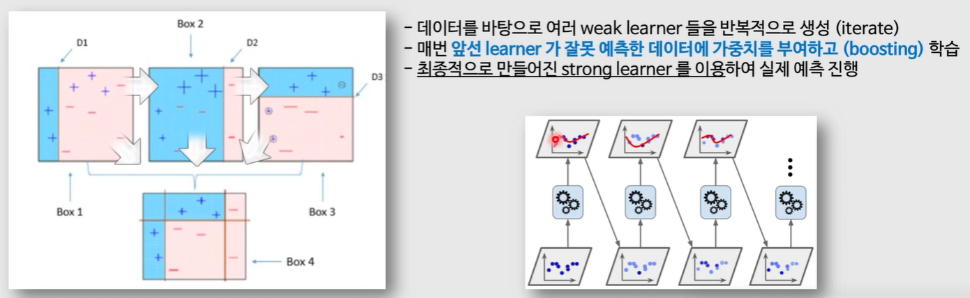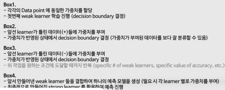 - 매번 앞선 learner가 잘못 예측한 데이터에 가중치를 부여하고 (boosting) 학습
